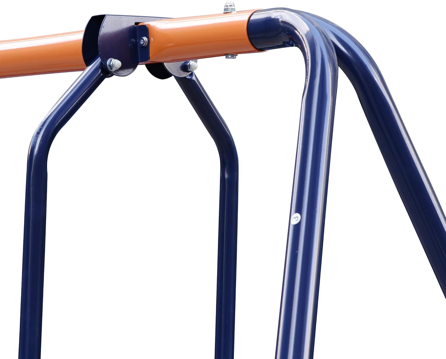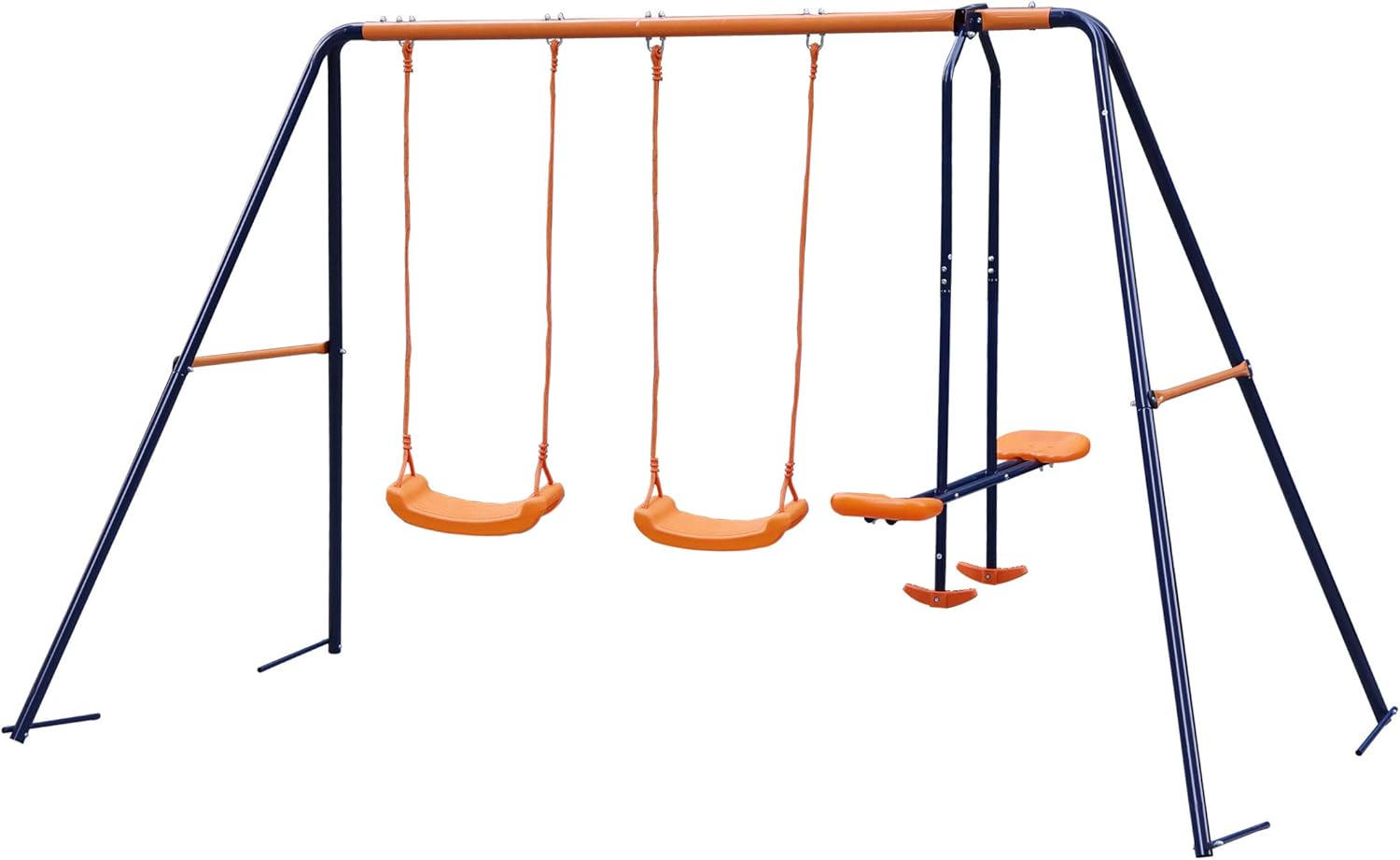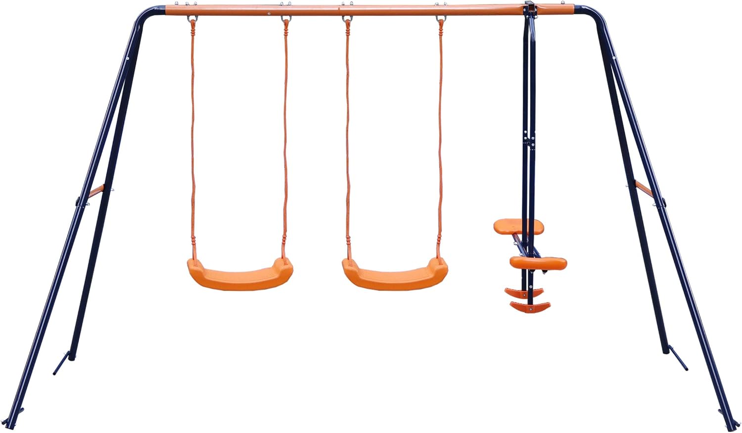 Components: 2 Plastic Single Person Swing, 1 Two-Person Glider Swing, Rope with Adjustable Hanging Height, Powder-Coated Steel Tubes.