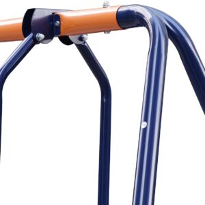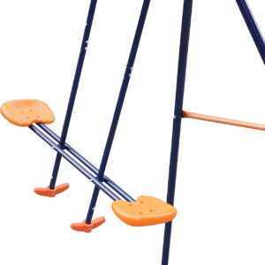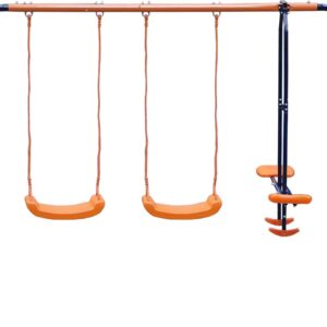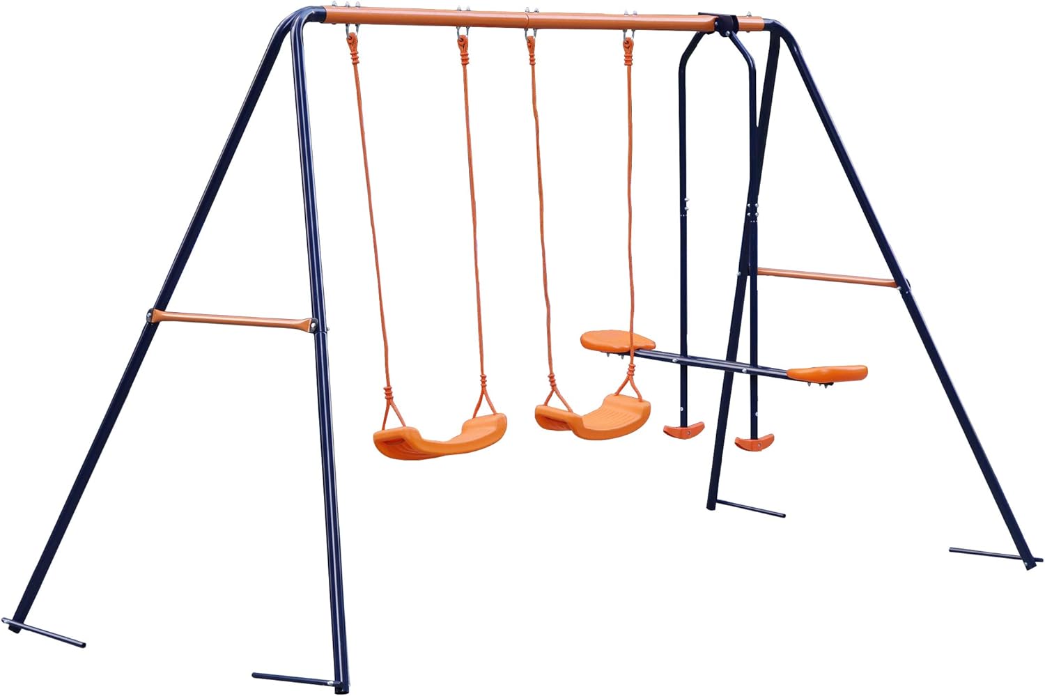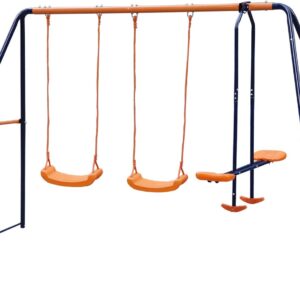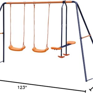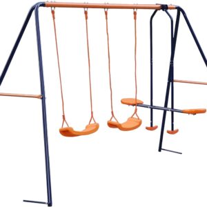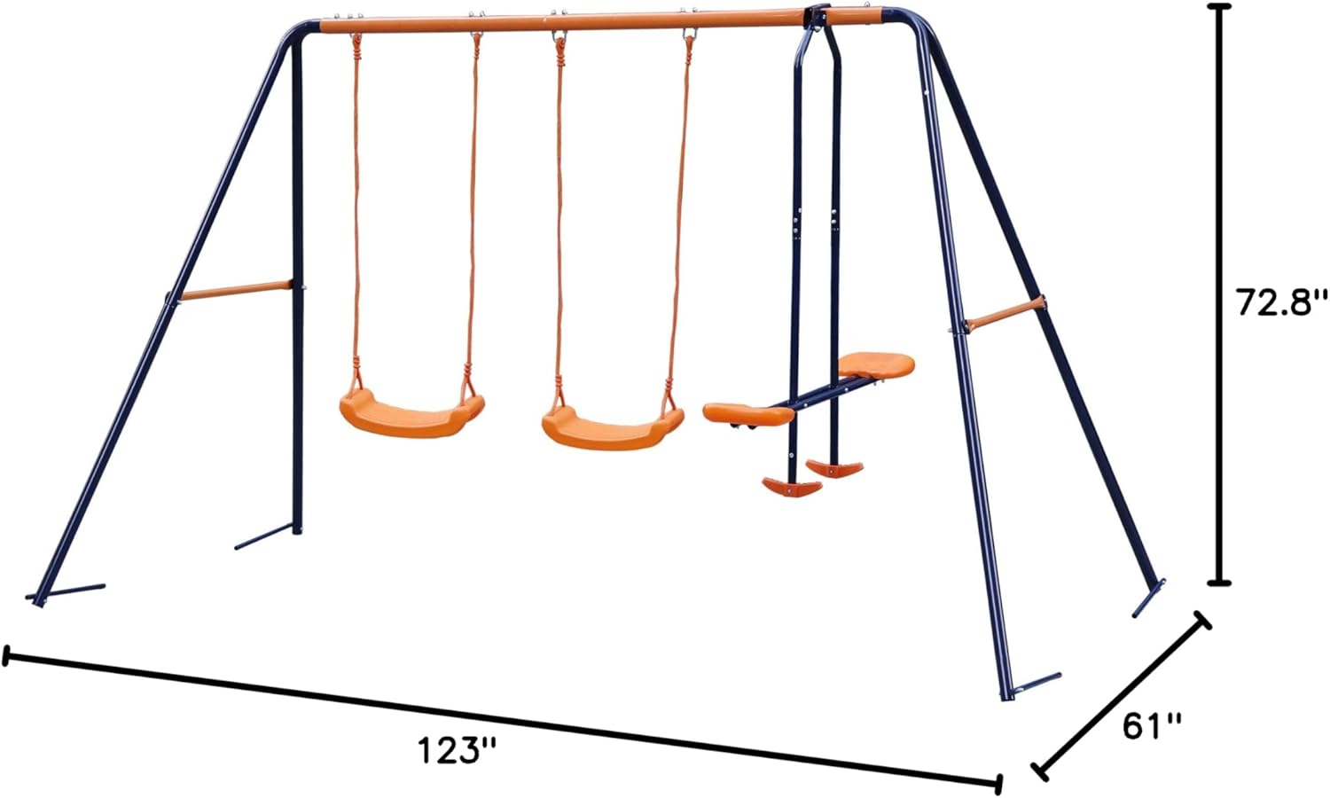 Components: 2 Plastic Single Person Swing, 1 Two-Person Glider Swing, Rope with Adjustable Hanging Height, Powder-Coated Steel Tubes.