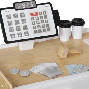 - 🎄The Pretend Play Store Toy includes a large stall with a cash register, a pull-out drawer, shelves and a lockable cabinet. 20 banknotes, 3 coins,credit card,customer card,grocery bag,6 containers for fruit and vegetables,2 display boxes for products. More than 60+pcs play food toy accessories made from cartons, cans and wood.
